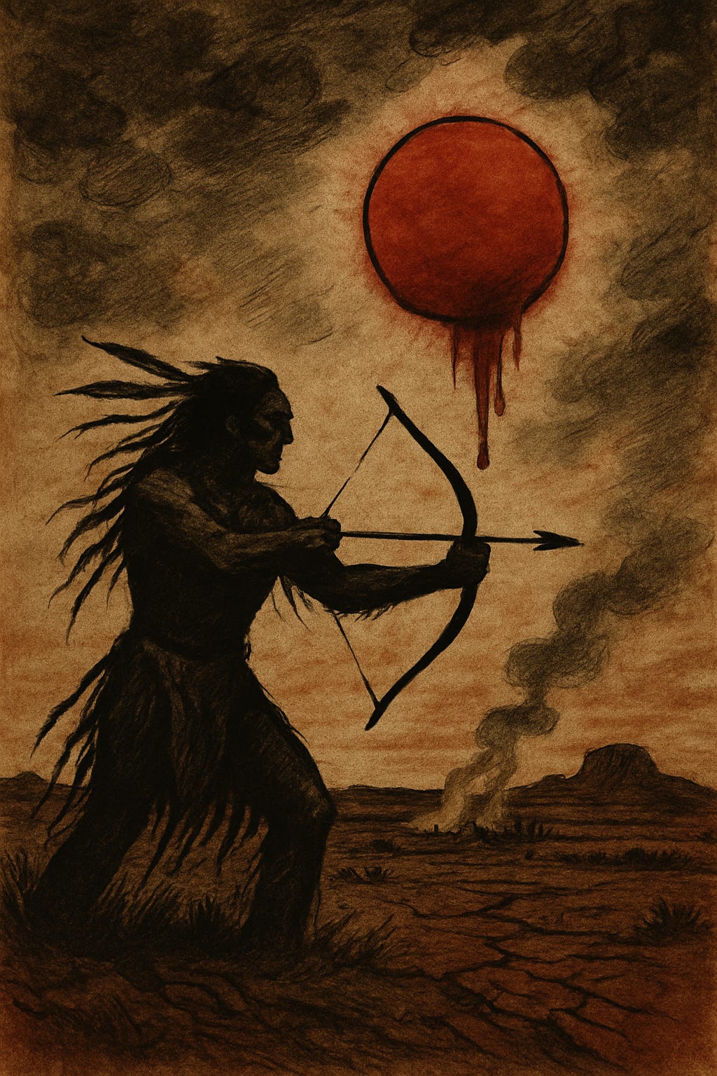 He turned towards him with eyes which reflected the fire like two obsidian stones, “It is said among the old ones, when the blood of too many mothers soaks the ground, one will rise to kill the sun. And nothing will be left but the bones of the earth.”